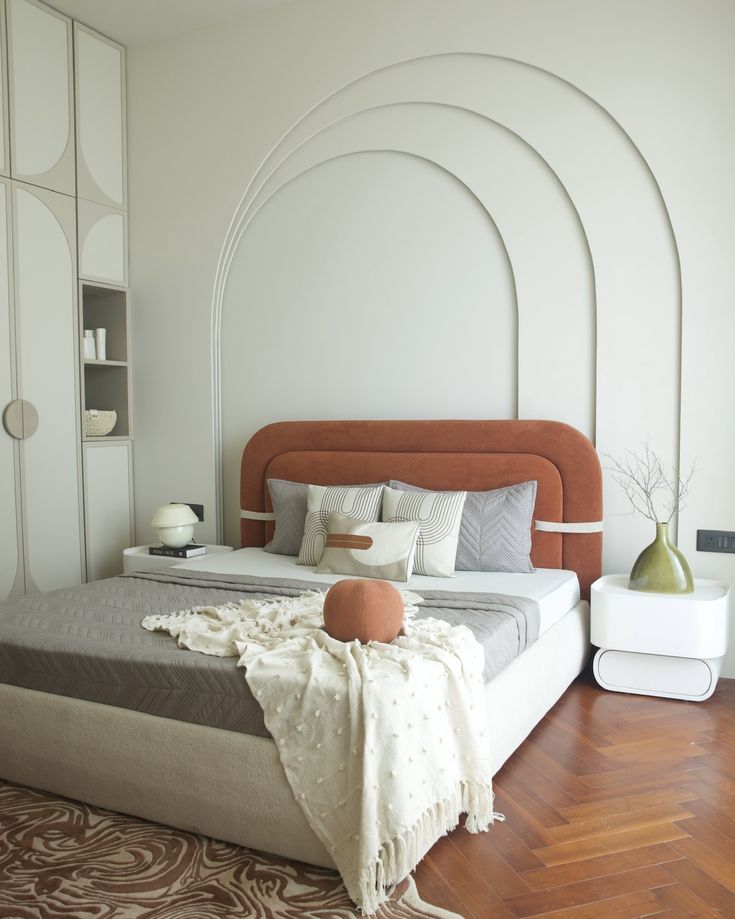 The Arvella TerraContour Bed embodies modern elegance with its warm terracotta-toned, triple-layered arc headboard and minimalist upholstered base. Designed to elevate contemporary interiors, this bed blends soft curves with refined geometry, creating a visually soothing focal point for any bedroom.