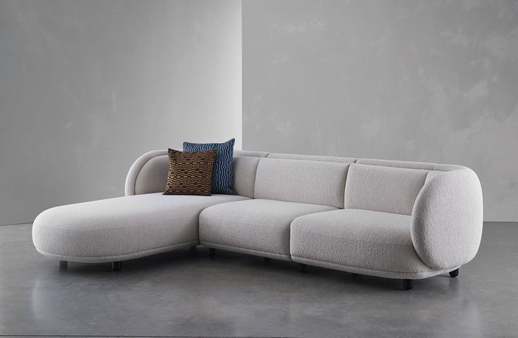 This sculpted sectional features a gently curved silhouette, plush bouclé upholstery, and rounded arm profiles that add softness and sophistication to any interior.